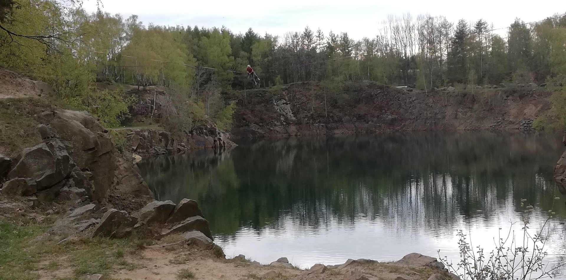 Am dritten Tag komme ich an einem aufgelassenen Steinbruch vorbei. Einige junge Leute haben es sich in der Nähe der Abbruchkante gemütlich gemacht. Sieht aus wie Picknick. Aber sie schauen immer wieder gebannt in eine gewisse Richtung zum Steinbruch und diskutieren eifrig über irgendwas, nur verstehe ich nicht worum es geht. Ich brauch ein paar Momente, bis ich gerafft hab, warum: Über den mit Wasser gefüllten Steinbruch hinweg ist eine Slackline gespannt. Schätzungsweise 50m lang, hängt in der Mitte etwas durch, kein Wunder bei der Distanz. Und jetzt erst bemerke ich den jungen Typen, der auf der Slackline sitzt. Ein paar Mal versucht er wieder drauf zu steigen, aber verliert jedesmal den Kampf mit der Schwerkraft. Wie gut, dass er mit einem kurzen Seil gesichert ist. Es geht da sicher 20 bis 30m in die Tiefe. Zu guter Letzt zieht er sich an der Line hängend zur sicheren Kante zurück. Uiiiih dieses Balancieren über diesem Abgrund, das wäre aber garnix für meinen Vater seinen Sohn. Aber es ist cool, dass diese jungen Menschen sich solchen Herausforderungen stellen. Mit diesen Gedanken im Kopf setze ich meine Wanderung fort.