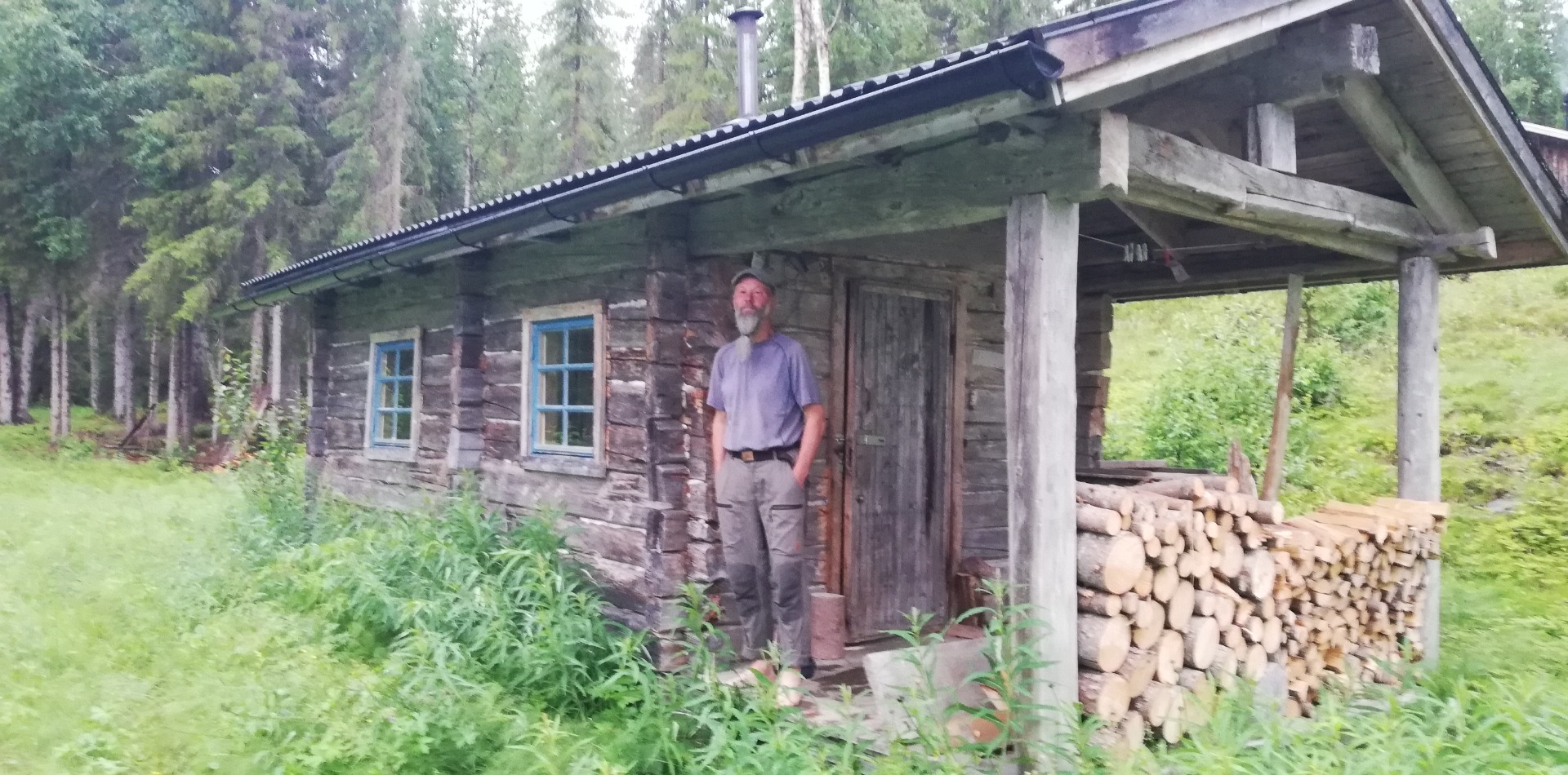 Ich schätze, ich werde noch etwa 2 bis 3 Tage bis Hemavan benötigen. Aber heut schüttet es seit in der Früh so derartig, dass keine rechte Wanderfreude aufkommen will. Das Grau der Wolken vermischt sich mit dem Grau des Dauerregens ohne das man das eine vom anderen unterscheiden könnte. Obelix würde sagen, der Himmel fällt einem auf den Kopf. Ich patsche lustlos durch den Regen über den völlig aufgeweichten Weg. Ich versuche irgendetwas Ermunterndes in der Umgebung oder in meinen Gedanken zu finden. Das dürfte heut schwierig werden. Spät am Nachmittag komme ich mitten im Wald an ein paar Ferienhäusern vorbei. Niemand wohnt zur Zeit hier, sonst hätte ich mich überwunden nach Unterkunft zu fragen.